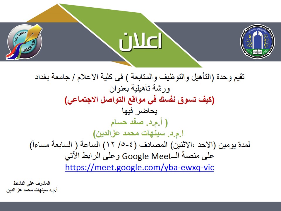 تقيم وحدة (التأهيل والتوظيف والمتابعة ) في كلية الاعلام / جامعة بغداد