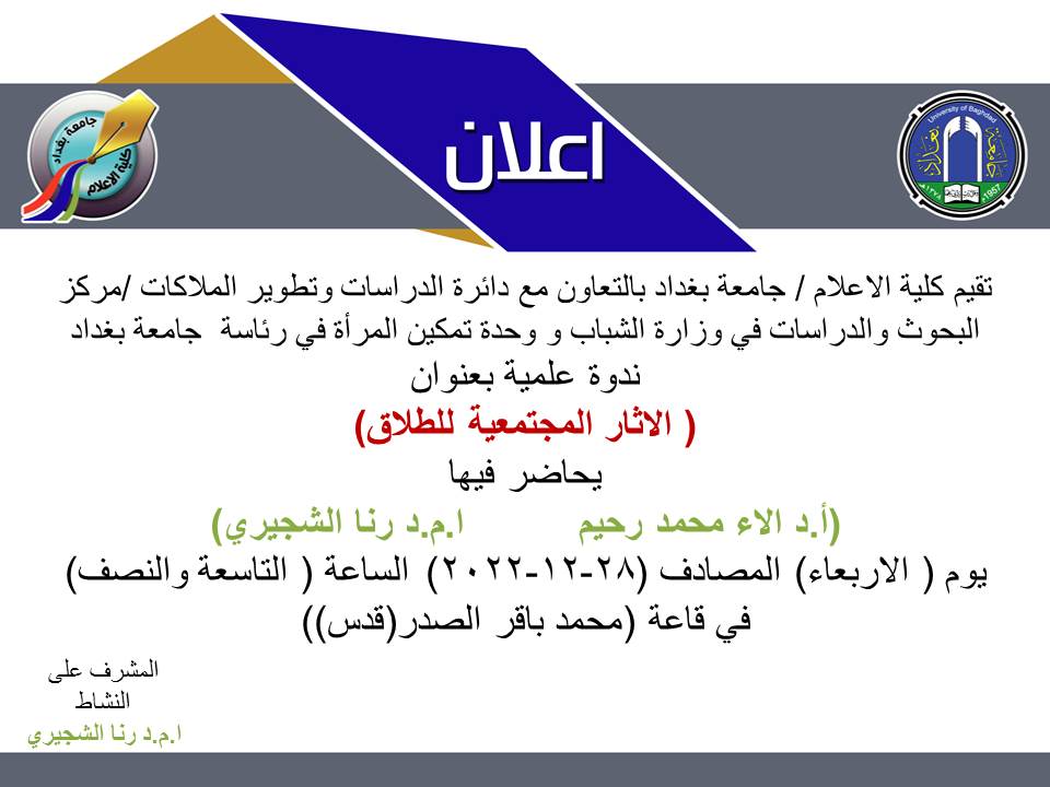 تقيم كلية الاعلام / جامعة بغداد بالتعاون مع دائرة الدراسات وتطوير الملاكات / مركز البحوث والدراسات في وزارة الشباب وحدة تمكين المرأة في رئاسة جامعة بغداد ندوة علمية ( الاثار المجتمعية للطلاق ) يحاضر فيها ( أ.د. الاء محمد رحيم و أ.م.د.رنا الشجيري ) يوم الاربعاء المصادف 28/12/2022 الساعة التاسعة والنصف في قاعة محمد باقر الصدر (قدس)