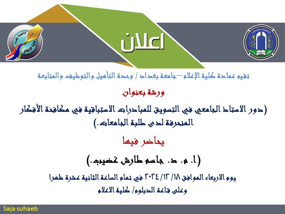 تقيم عمادة كلية الاعلام بجامعة بغداد وخدة التأهيل والتوظيف ورشة بعنوان (دور الاستاذ الجامعي، في التسويق للمبادرات الاستباقية في مكافحة الأفكار المنحرفة لدى ﻄلبة الجاﻤعات ) يحاضر فيها كل من ا.م.د. جاسم طارش غضيب يوم الاربعاء الموافق ١٨/١٢/٢٠٢٤ في تمام الساعة الثانية عشر ظهرا وعلى قاعة الدبلوم / كلية الاعلام