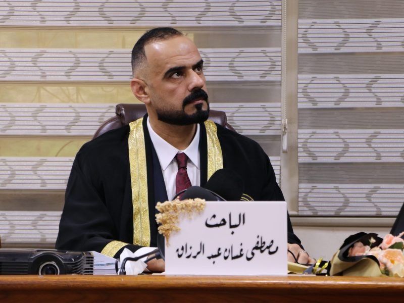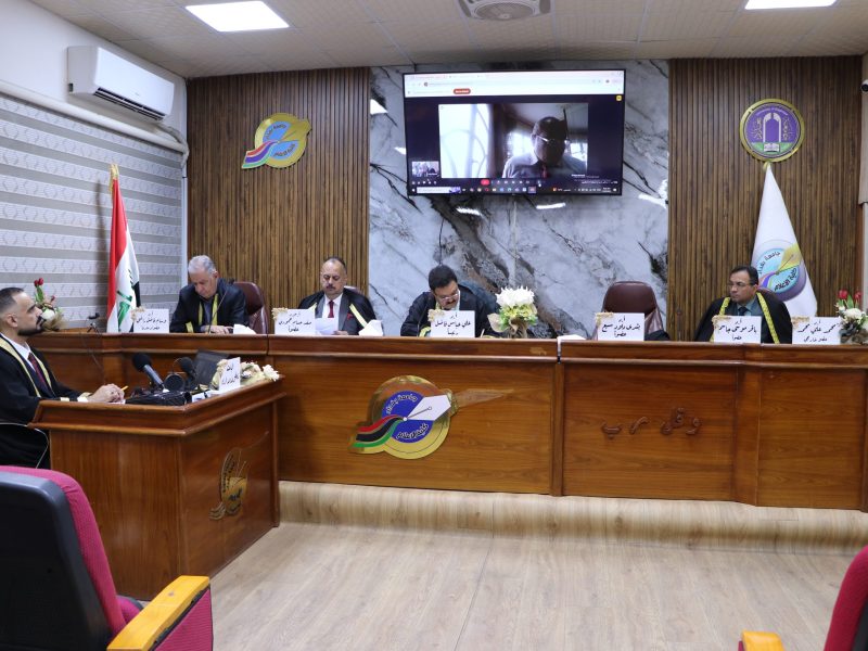 وتألفت لجنة المناقشة من الاستاذ الدكتور علي عباس رئيساً والأستاذ الدكتور وسام فاضل مشرفاً ، وعضوية الاستاذ الدكتور بشرى داود السنجري والأستاذ الدكتور باقر موسى جاسم والأستاذ المساعد الدكتور صفد حسام ، فضلاً عن الاستاذ الدكتور محمد علي من جامعة الزقازيق عضواً خارجياً.