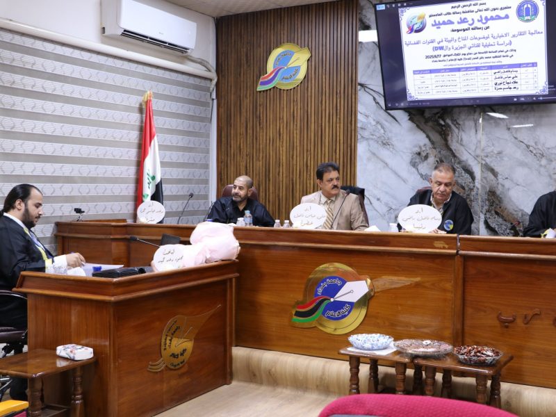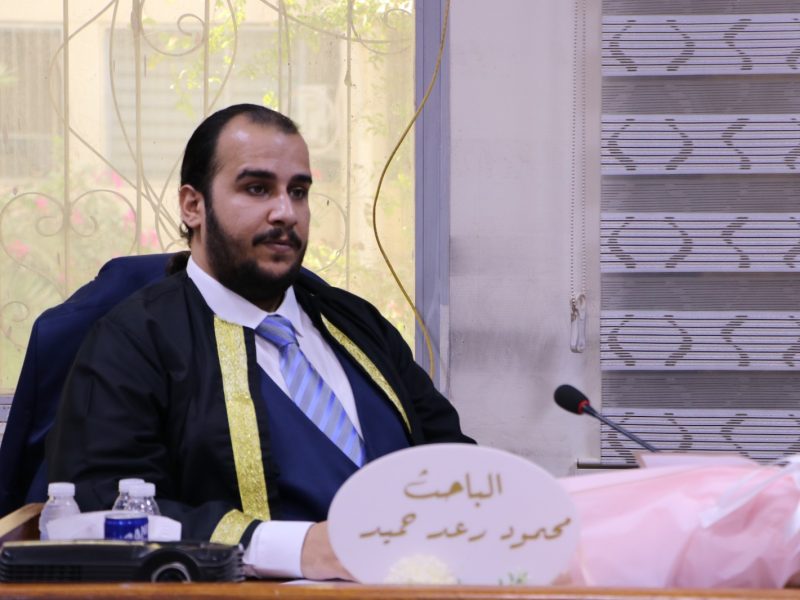 وتألفت لجنة المناقشة من الاستاذ الدكتور وسام فاضل راضي رئيساً ، والأستاذ الدكتور رعد جاسم مشرفاً وعضوية الاستاذ الدكتور علي عباس ، فضلاً عن الاستاذ المساعد الدكتور علاء نجاح عضواً خارجياً.