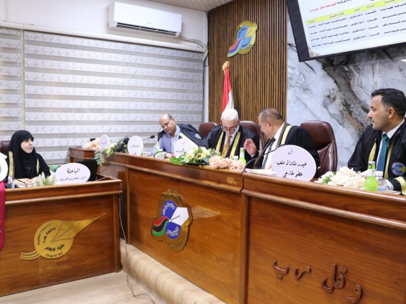 وتألفت لجنة المناقشة من الاستاذ الدكتور طالب عبد المجيد رئيساً والأستاذ الدكتور محسن جلوب جبر مشرفاً وعضوية الاستاذ الدكتور حسين علي نور ، فضلاً عن الاستاذ الدكتور حيدر شلال عضواً خارجياً.