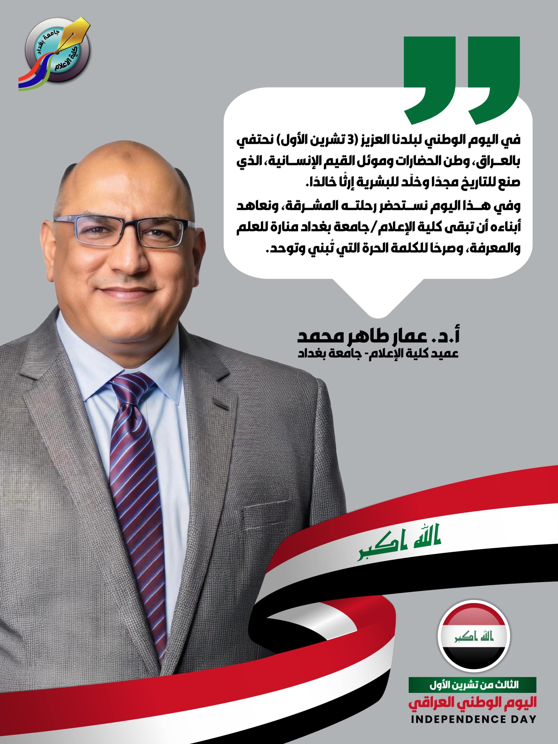 وفي هذا اليوم نستحضر رحلته المشرقة، ونعاهد أبناءه أن تبقى كلية الإعلام/جامعة بغداد منارة للعلم والمعرفة، وصرحًا للكلمة الحرة التي تُبني وتوحد.
