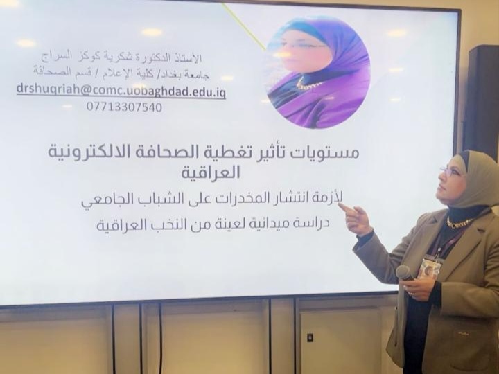 وقدمت دراسة بعنوان “تأثير تغطية الصحافة الإلكترونية العراقية لأزمة المخدرات على الشباب الجامعي”، استندت إلى عينة من 400 مشارك من الأكاديميين والإعلاميين والأمنيين والدينيين.